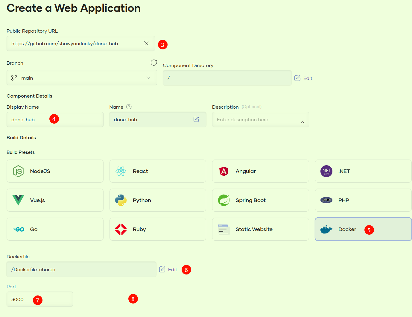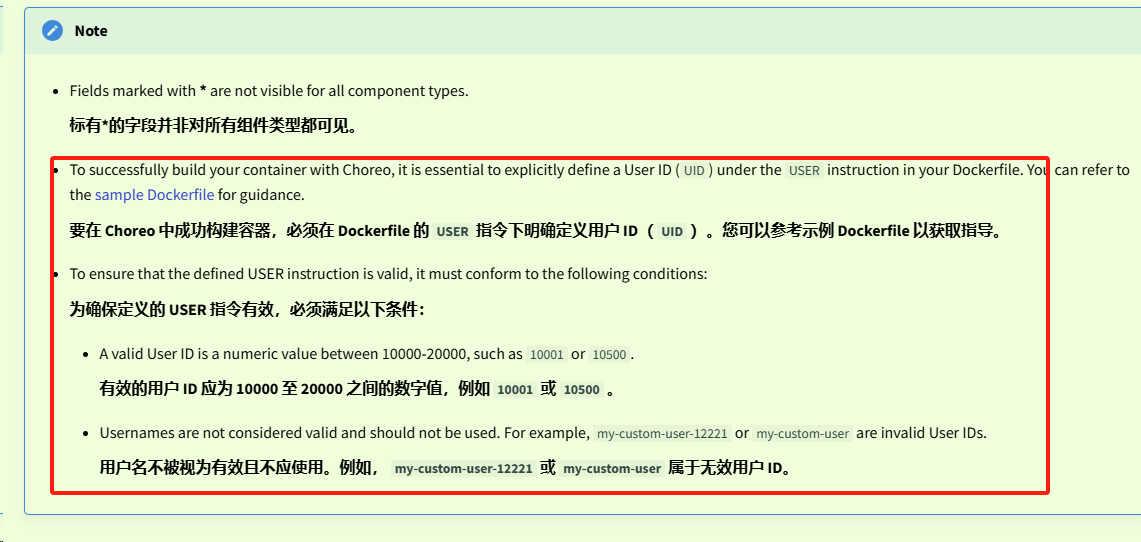 Dockerfile-choreo, 把 Dockerfile的内容复制到Dockerfile-choreo中, 在运行命令前面加上USER 10014, 这一步尤其重要, 可参考文件:done-hub/Dockerfile-choreo at main · showyourlucky/done-hub · GitHubUSER 10014 ENTRYPOINT ["/done-hub"]- 同理, 使用dockerfile部署其它项目也要指定 用户 ID, 参考文档:https://wso2.com/choreo/docs/develop-components/deploy-a-containerized-application/